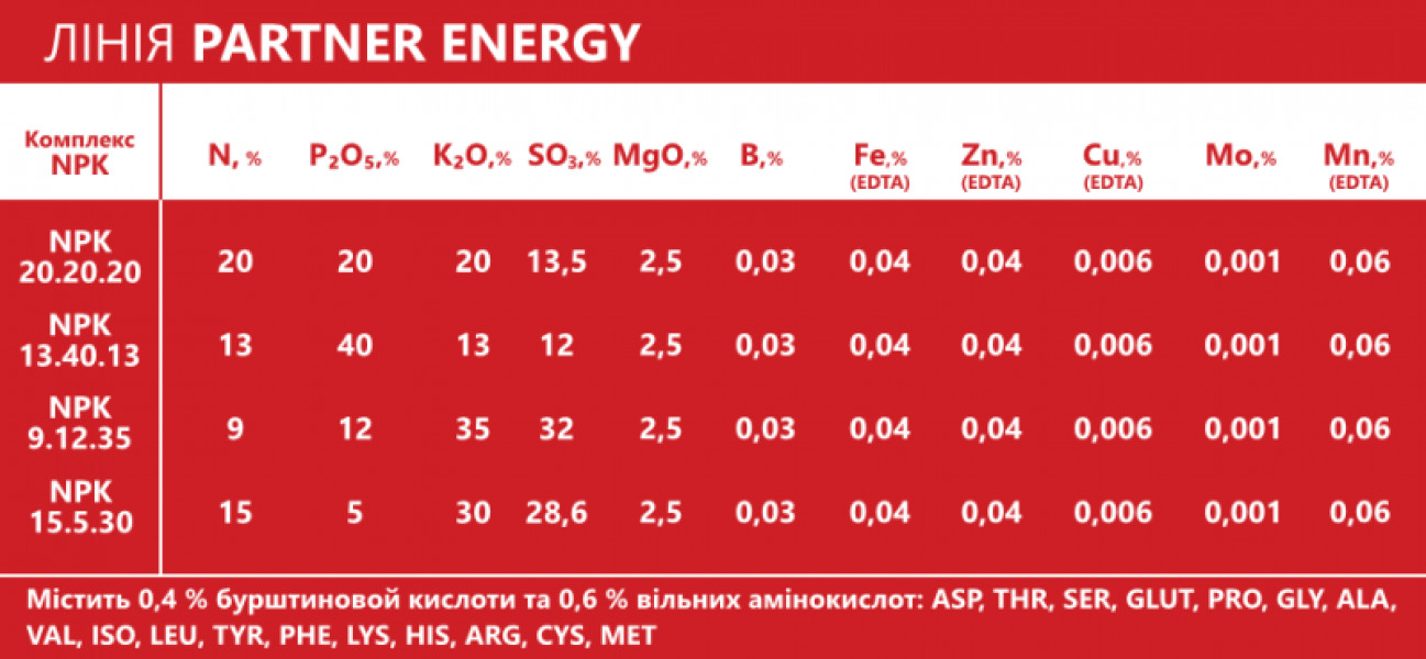 - Комплекси NPK + мезо-мікроелементи + 17 амінокислот + бурштинова кислота - захищають від стресів, підвищують стійкість до хвороб і посухи. /